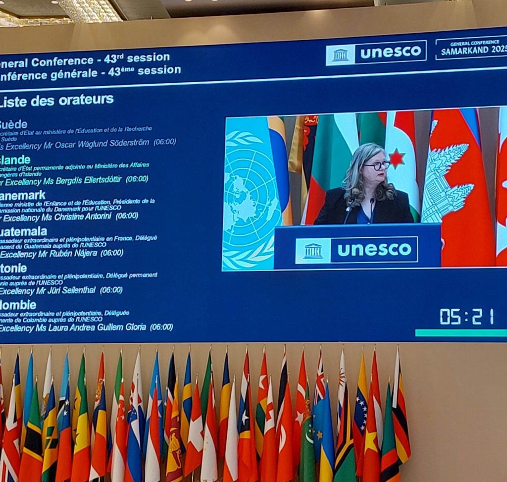Bergdís Ellertsdóttir, vararáðuneytisstjóri í utanríkisráðuneytinu, fór fyrir sendinefnd Íslands á aðalráðstefnunni í Samarkand en aðrir fulltrúar komu frá íslensku UNESCO-nefndinni og fastanefnd Íslands í París. Í stefnuræðu Íslands á ráðstefnunni lagði Bergdís áherslu á mannréttindi, jafnrétti kynjanna og réttindi hinsegin fólks í verkefnum stofnunarinnar. Fjallaði hún um mikilvægt starf stofnunarinnar bæði í Úkraínu og á Gaza þar sem hún styður við áframhaldandi menntun, vernd fjölmiðla- og vísindamanna og sinnir verndar- og eftirlitshlutverki vegna skemmda á menningarminjum. Vakti hún einnig sérstaka athygli á ábyrgð UNESCO á heimsmarkmiði fjögur um menntun og stöðu kvenna og stúlkna í Afganistan og sagði í því samhengi: